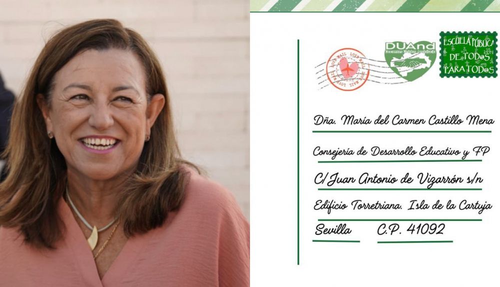 La intención es entregarle a la consejera, María del Carmen Castillo Mena, varios regalos (entre los que estarían un ramo de crisantemos, una edición en francés de Los Miserables de Víctor Hugo), así como multitud de postales, como las de la imagen que ilustra esta publicación, con las quejas y reivindicaciones de los docentes.