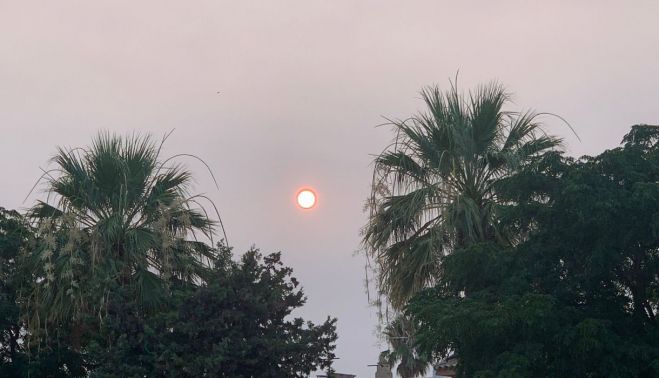 Las partículas en suspensión como consecuencia de los referidos incendios han formado una gran nube que le da ese color anaranjado al astro rey.