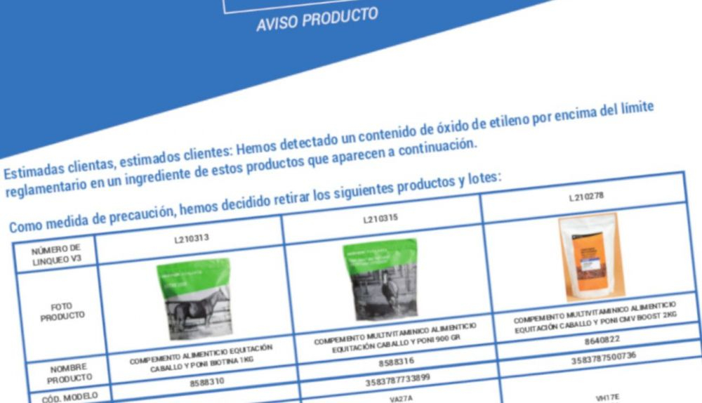 En concreto, están afectados los lotes VA14, VC15, VD12, VE26A,VF07A, VG13A, VH16 Y VB11B del Complemento alimenticio equitación caballo y poni Biotina 1kg, los lotes VA27A, VB22A, VC02A, VD01, VE03, VE28A, VF15A, VG15, VG27 y VH17B del Complemento multivitamínico alimenticio equitación caballo y poni 900 gr y los lotes VH17E, VG15A, VG27A, VE25B y VG06A del Complemento multivitamínico alimenticio equitación caballo y poni CMV boost 2kg.