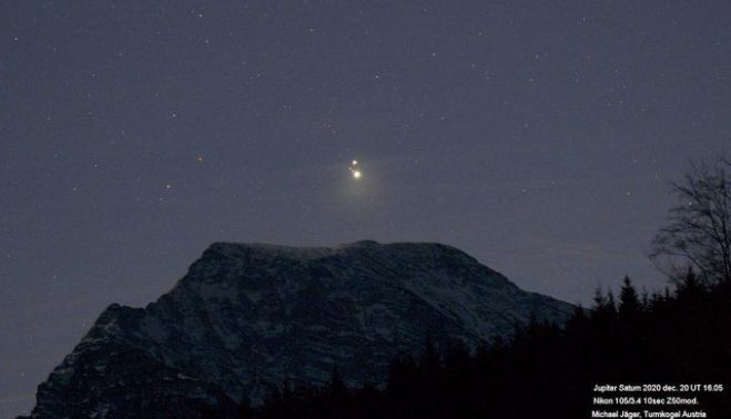 A partir de las 17:25 horas de la tarde de este pasado lunes se pudo ver por fin la gran conjunción de Júpiter y Saturno. El fenómeno conocido popularmente como la Estrella de Belén, que es visible cada 800 años, se ha dejado ver en su totalidad justo al caer el sol y durante aproximadamente una hora.