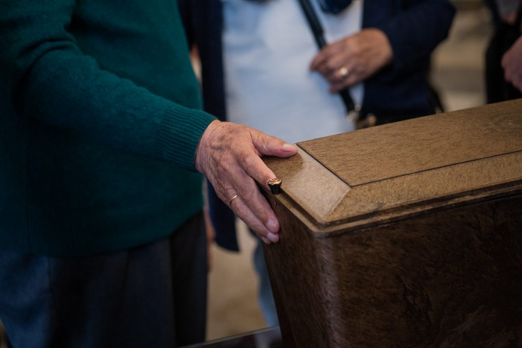 Miguel, tocando la caja con los restos de Alfonso López Quera, fusilado en 1936. FOTO: MANU GARCÍA