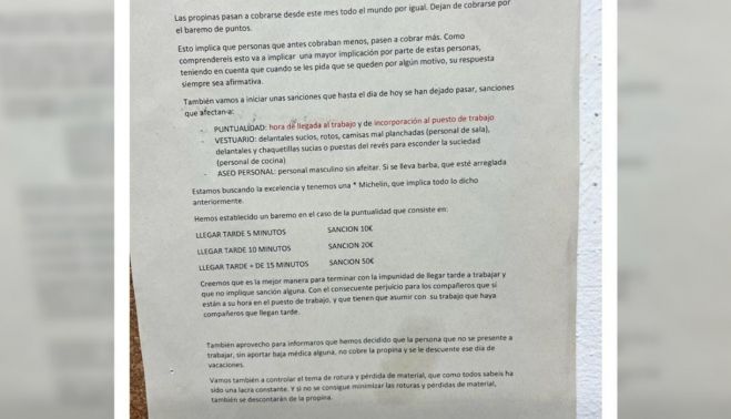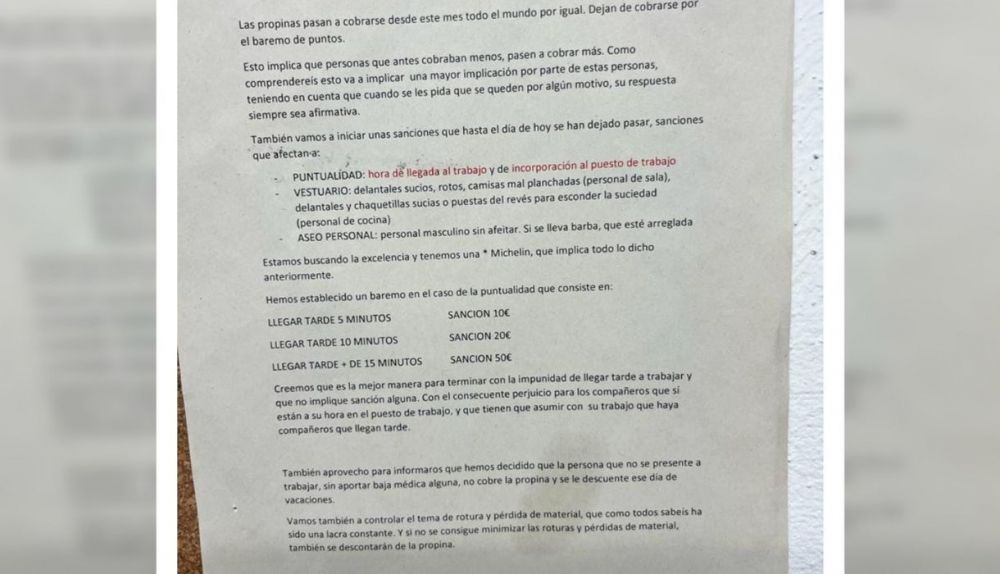 Por si no fuera suficiente, el restaurante también ha anunciado que va a controlar el tema de "rotura y pérdida de material". Los platos rotos también tendrán que correr del bolsillo de los trabajadores.