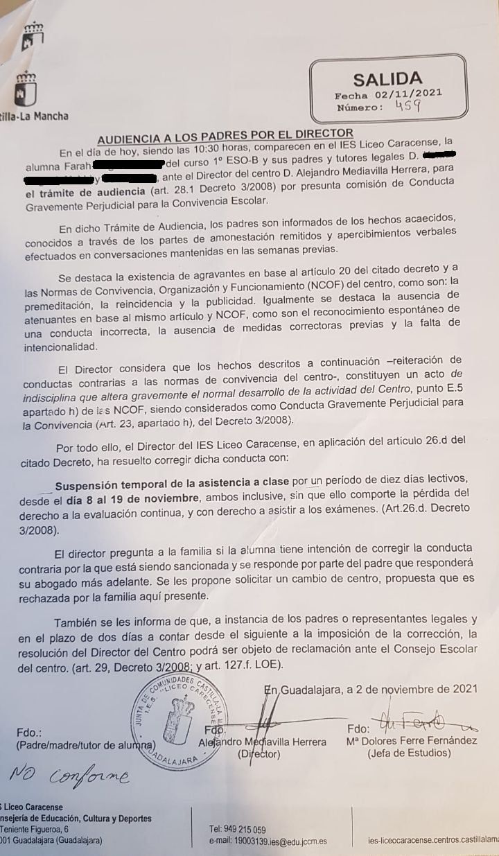 La joven Farah, de 13 años, ha sido expulsada del Liceo Caracense de Guadalajara desde este lunes hasta el próximo 19 de noviembre por llevar hiyab -velo que cubre la cabeza y el pecho que las mujeres musulmanas- a las clases. La alumna no pierde el derecho a evaluación continua ni a asistir a los examenes si se convocan. El centro educativo ha tomado esta decisión porque sostiene que existe "comisión de conducta gravemente perjudicial para la convivencia escolar" y destaca la existencia de “agravantes” relacionados con el Decreto 3/2008 de la Convivencia Escolar en Castilla-La Mancha y con las Normas de Convivencia, Organización y Funcionamiento (NCOF).