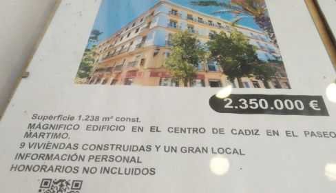 Menciona 1.238 metros cuadrados construidos, con "nueve viviendas construidas y un gran local". Para los gaditanos, o foráneos, interesados en saber cuánto vale un edificio de esas características en pleno corazón turístico de la ciudad, el precio que se menciona para la venta es de 2.350.000 euros.