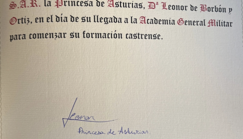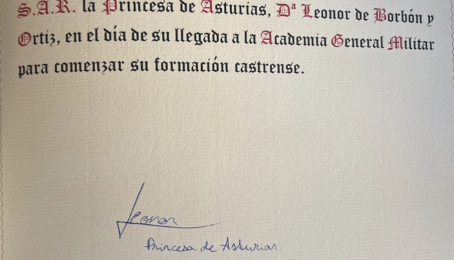 La Casa Real ha divulgado la firma de la princesa Leonor que plasmó en el libro de honor de la Academia Militar de Zaragoza el día de su ingreso para iniciar su primer periodo de formación castrense.