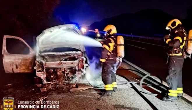Completamente calcinada ha quedado una furgoneta tras salir ardiendo en la autopista entre Sevilla y Cádiz. El suceso ha tenido lugar en el kilómetro 82,5, sentido capital hispalense, de la AP4.