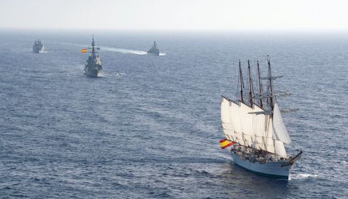 Ya en aguas de la Bahía gaditana, el buque escuela Juan Sebastián de Elcano de la Armada española navegará seguido de tres fragatas, un buque de asalto anfibio,el portaeronaves Juan Carlos I, varios patrulleros, así como unidades aéreas de la quinta y décima escuadrilla. Cinco veteranos Harrier harán una pasada sobre la zona cuando finalice la revista del Juan Sebastián de Elcano.