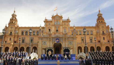 El acto central de la Policía se ha celebrado en la Plaza de España, con la presencia, entre otras autoridades, del presidente de la Junta de Andalucía, Juan Manuel Moreno; el alcalde de Sevilla, José Luis Sanz; el delegado del Gobierno en Andalucía, Pedro Fernández; el secretario de Estado de Seguridad, Rafael Pérez; y el director de la Policía, Francisco Pardo.