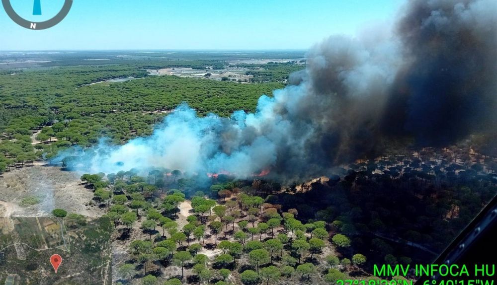 El Plan Infoca, servicio de extinción de incendios forestales de Andalucía, ha desplegado 17 medios aéreos y más de 150 efectivos para tratar de extinguir el incendio declarado este sábado en un paraje de Huelva, ubicado en la localidad de Bonares.