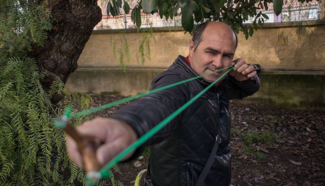 Suena música del interior del pabellón de Guadalcacín (Jerez). En el exterior, un grupo de hombres juega a la petanca, y al fondo, José Vela (Torremelgarejo, Jerez, 1968) descansa sobre un taburete. Sostiene un tirachinas fabricado por él. Estira el brazo derecho hacia delante. Levanta el codo izquierdo, lleva la goma hacia atrás…, y suelta el pellizco de la badana. Los objetivos están a 10 metros. Sus muletas, a dos.
