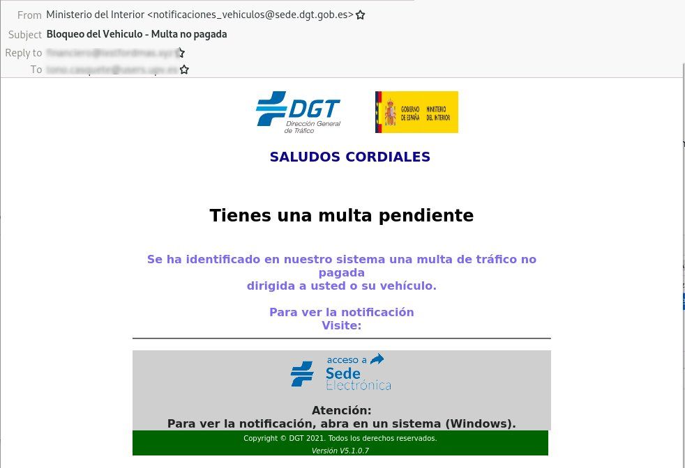 Se ha detectado una campaña fraudulenta a través del correo electrónico (phishing) suplantando a la Dirección General de Tráfico (DGT). El mensaje contiene un enlace a una supuesta notificación que descarga malware en el dispositivo.