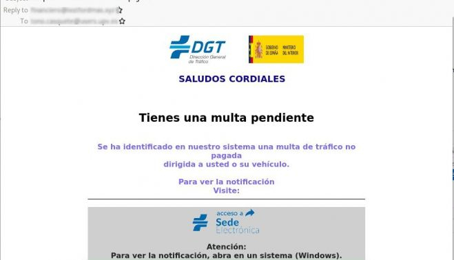 ⚠ #ALERTA❗ Detectada campaña fraudulenta a través del correo electrónico (#phishing) suplantando a la Dirección General de Tráfico (@DGTes ). El mensaje contiene un enlace a una supuesta notificación que descarga #malware en el dispositivo. #NoPiques https://t.co/tK2LxrOlqY pic.twitter.com/SYxE3lh6g9
