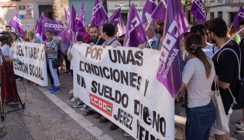 Desde CCOO, sindicato desde el cual se ha denunciado la situación laboral que sufre esta plantilla, han leído el manifiesto por un trabajo decente, donde organizaciones sindicales reivindican el trabajo digno y con derechos. "Hoy el ejemplo son nuestras compañeras de los cines de Jerez, los Cines Yelmo, donde no están dignamente remuneradas. Y desde aquí pedimos que hasta que no se llegue a un acuerdo, no se va a los Cines Yelmo. La gerente está boicoteando la huelga de los trabajadores, los empleados nos piden el apoyo y la solidairdad", apostilla un sindicalista de CCOO.