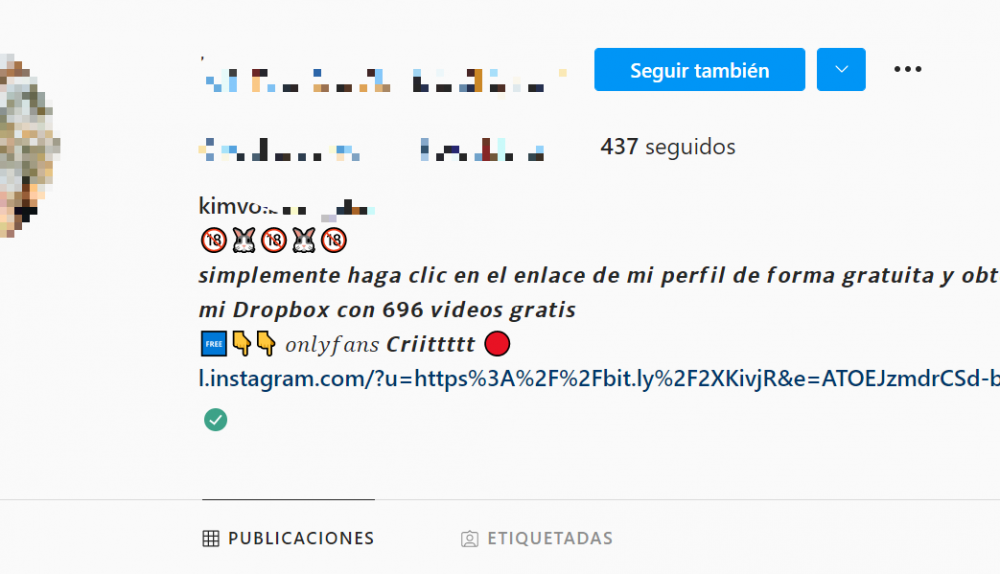 Suena una notificación de Instagram en tu móvil, lo abres, ves que es una petición de amistad y corres a ver quién es. Otro usuario con nombre desconocido: @kimvo.bovu_abergsun ha comenzado a seguirte. Has perdido la cuenta de cuántos perfiles falsos han deseado interactuar contigo. Son todos bastante similares: tienen pocos seguidores, pocas publicaciones o ninguna, una atractiva foto de una mujer semidesnuda de foto de perfil y un mensaje que te incita a que hagas click en una web para ver más contenido. Ahí está la trampa.