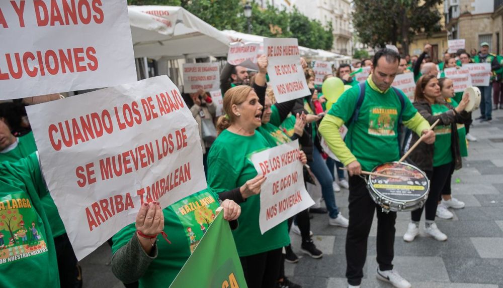 Una nube de camisetas verdes inunda la plaza del Arenal de Jerez. El ruido es ensordecedor, y lo provocan el centenar de parcelistas de Haza Larga, una finca situada entre las Entidades Locales Autónomas de Guadalcacín y Nueva Jarilla que protestan por la orden de Urbanismo que quiere restaurar los terrenos y eliminar las edificaciones de las 108 parcelas que ocupan más de cinco hectáreas en un suelo no urbanizable (rústico) de especial protección. “Después de engañados y estafados nos lo quieren quitar”, “por confiar en un notario aquí nos vemos”, se puede leer en las pancartas que portan durante la protesta, que se traslada a la puerta del Ayuntamiento.