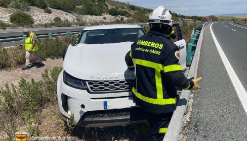 Una salida de vía en el kilómetro 12 de la A-382 (Jerez-Antequera) pudo acabar mucho peor, de no ser por la pericia y buen hacer de los bomberos del Consorcio Provincial de Cádiz.