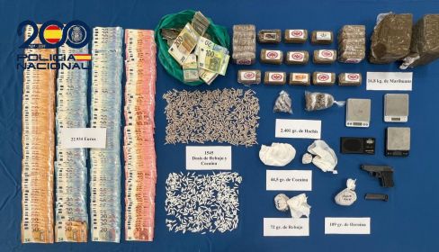Destaca la Policía en su nota la intervención de 1.699 dosis de heroína, cocaína y de la mezcla de ambas sustancias conocido como rebujito, dosis ya listas para su venta directa a los toxicómanos, así como más de 16 kilos de marihuana (16.850 gramos), dos kilos y medio de hachís (2.500 gramos), 79 dosis de medicamentos opiáceos y metadona que vendían de forma ilícita, más de un kilo de sustancia adulterante (1.200 gramos), 22.934 euros en metálico, un vehículo tipo turismo, gran cantidad de joyas, 261 cajetillas de tabaco de contrabando, útiles y herramientas para la manipulación de las sustancias, básculas de precisión, una porra extensible y un arma de fuego tipo pistola con un cargador completo de cartuchos de 9 mm.