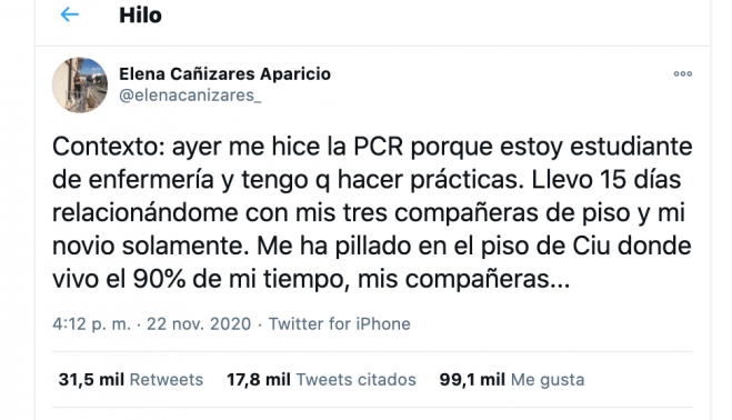 "Ayer me hice la PCR porque soy estudiante de Enfermería y tengo que hacer prácticas. Llevo 15 días relacionándome con mis tres compañeras de piso y mi novio solamente. Me ha pillado en el piso de Ciu donde vivo el 90% de mi tiempo, mis compañeras de piso se fueron a sus pueblos para el finde. Les informo que me han dado el positivo, me dicen en videollamada que me debería ir a mi pueblo con mis padres (de más de 60 años, uno infartado y otra con hipertensión) para que ellas, cuando acaben la cuarentena que tienen que hacer por haber estado juntas, puedan volver al piso", relata Elena Cañizares en Twitter. El hilo publicado se ha viralizado, con casi 50.000 retuits y cerca de 98.000 me gusta cuando se escriben estas líneas.
