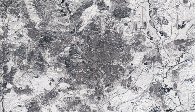Aunque esta imagen por satélite fue tomada una vez que la borrasca había pasado, es evidente que aún queda mucha nieve, especialmente en las afueras de la ciudad.