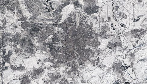 Por ejemplo, algunas de las pistas del aeropuerto, que se aprecian en la parte superior derecha de la imagen, siguen cubiertas de nieve. Se espera que las temperaturas excepcionalmente bajas que está experimentando la Península Ibérica continúen a lo largo de la semana, llegando a alcanzar los -12 °C.