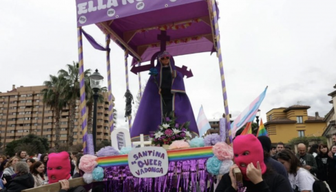 Una gran indignación ha creado en el mundo cofrade y religioso la procesión que se ha celebrado en Gijón con motivos de los actos reivindicativos por el 8M. La asociación Ama Asturies ha sacado a la calle una especie de paso con una simulación de una Virgen de Covadonga con color morado y la bandera arcoíris. "Contra el fascismo, ella nos guía", ha sido el lema elegido para la manifestación que han llevado a cabo por las calles de la localidad asturiana.