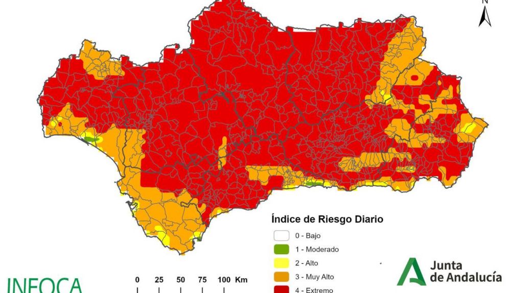 Así, para este sábado, el nivel de riesgo previsto es extremo en amplias zonas de Córdoba, Granada y Jaén, así como en algunos puntos de Málaga, Sevilla y Huelva. Cádiz y Almería se libran, con apenas algunos pequeños puntos de riesgo extremo. Pero casi toda la comunidad andaluza estará en riesgo muy alto, salvo la costa de Almería, que queda en riesgo alto. Para el domingo y lunes, la situación empeora notablemente, con prácticamente toda Andalucía en riesgo extremo, salvo Cádiz y algunas zonas de la costa de Huelva y de Almería.