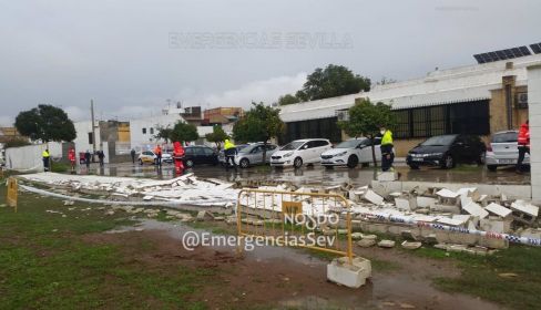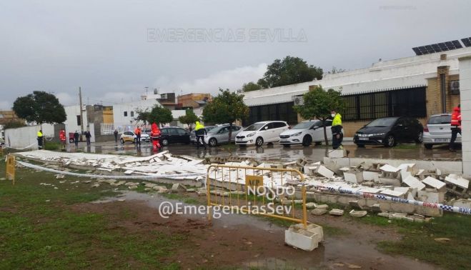 El temporal de lluvia que este miércoles castiga a la provincia de Sevilla ha provocado la caída de un muro exterior de un colegio en la calle Santiponce, en el barrio hispalense Torreblanca, aunque sin daños personales algunos. Cuando se produjo la caída, no había niños ni transeúntes en la zona.