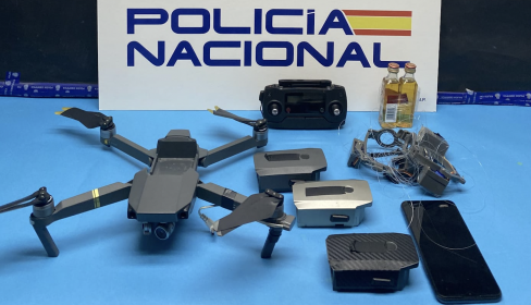 En el marco de las funciones de seguridad perimetral y prevención de hechos ilícitos en el entorno de los penales, encomendadas al Cuerpo Nacional de Policía, cuyo objetivo es la detección de intromisiones tanto por vía terrestre como aérea, mediante vehículos aéreos no tripulados, fueron identificados tres individuos a bordo de un vehículo, estacionado de forma oculta en un carril próximo al Centro Penitenciario Puerto 2, en cuyo registro fue descubierto un dron, su mando controlador, tres baterías, hilo de pesca con cuatro engarces, junto con un paquete envuelto en plástico negro, que contenía el móvil y las dos mini botellas del destilado.