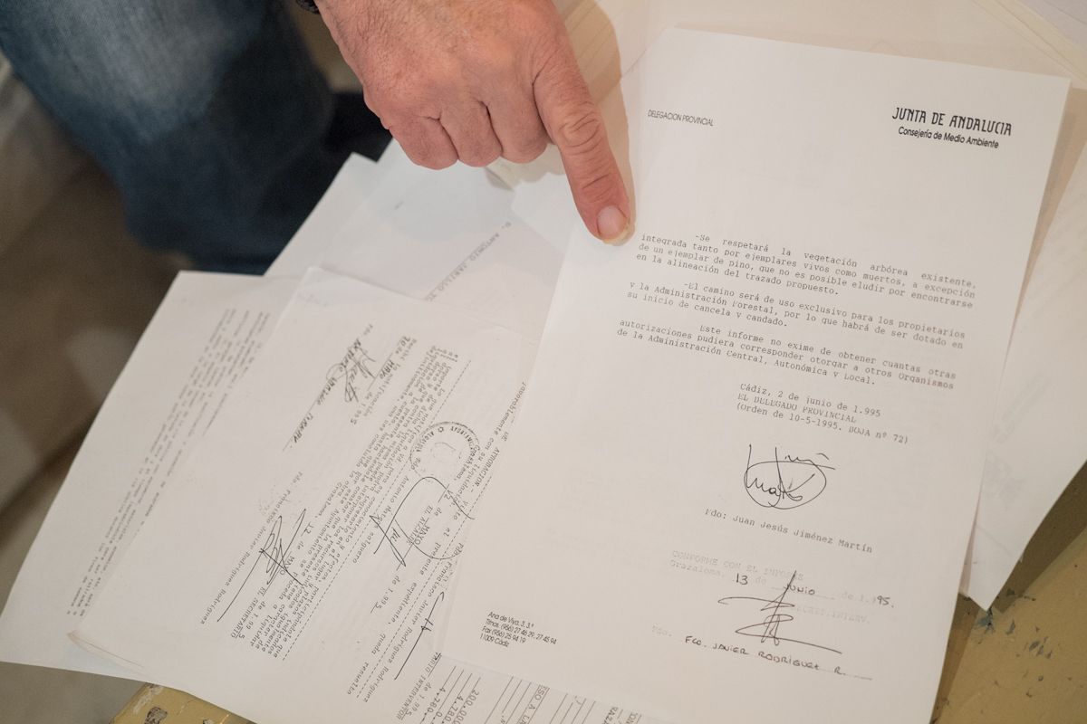 Carlos Pomar mostrando el escrito en el que la Junta le da una serie de requisitos para abrir un nuevo carril. FOTO: MANU GARCÍA.Sin embargo, Pomar destaca que no quiso privar a los senderistas de la belleza del paisaje que se contempla desde su finca. Es por ello que jamás selló la cancela y dejó que la ciudadanía transitara libremente por el nuevo carril —llano y de fácil acceso—que tanto pelearon. Por aquel entonces nadie protestó. El problema llegó más tarde, cuando en 2014 Pomar descubre que el Ayuntamiento de Grazalema había comenzado en 2010 un procedimiento para declarar dicho camino como "Bien de Dominio Público adscrito al Uso Público".