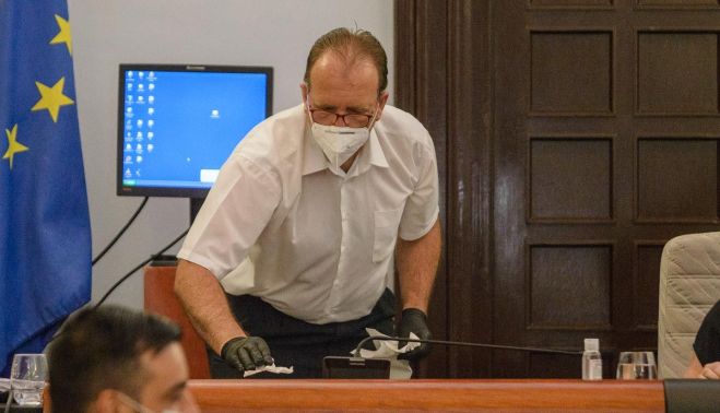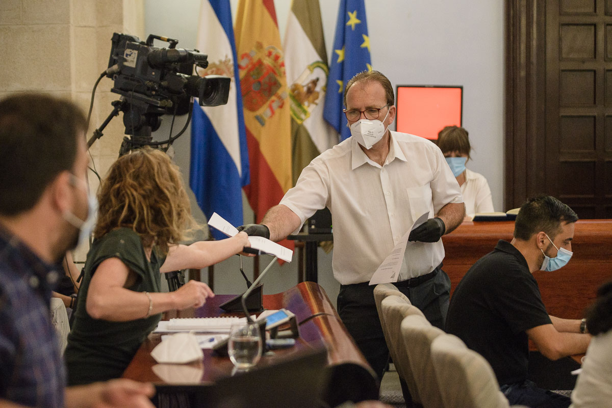 Javier Rosa se puso su uniforme de ordenanza municipal una mañana más. Volvió a subir bien temprano la cuesta de la Alcubilla, como hace cada día para acudir a su puesto de trabajo. Pero esta mañana de último jueves del mes de mayo era diferente. El pleno municipal reanudaba sus sesiones ordinarias y retomaba sus sesiones presenciales, tres meses después de que toda la Corporación se viera las caras por última vez en el salón del Consistorio jerezano. En formato reducido, solo con algunos representantes políticos, pero allí volvían a reunirse.