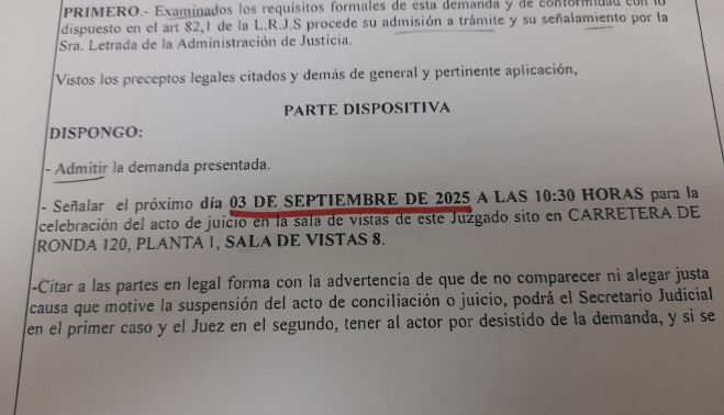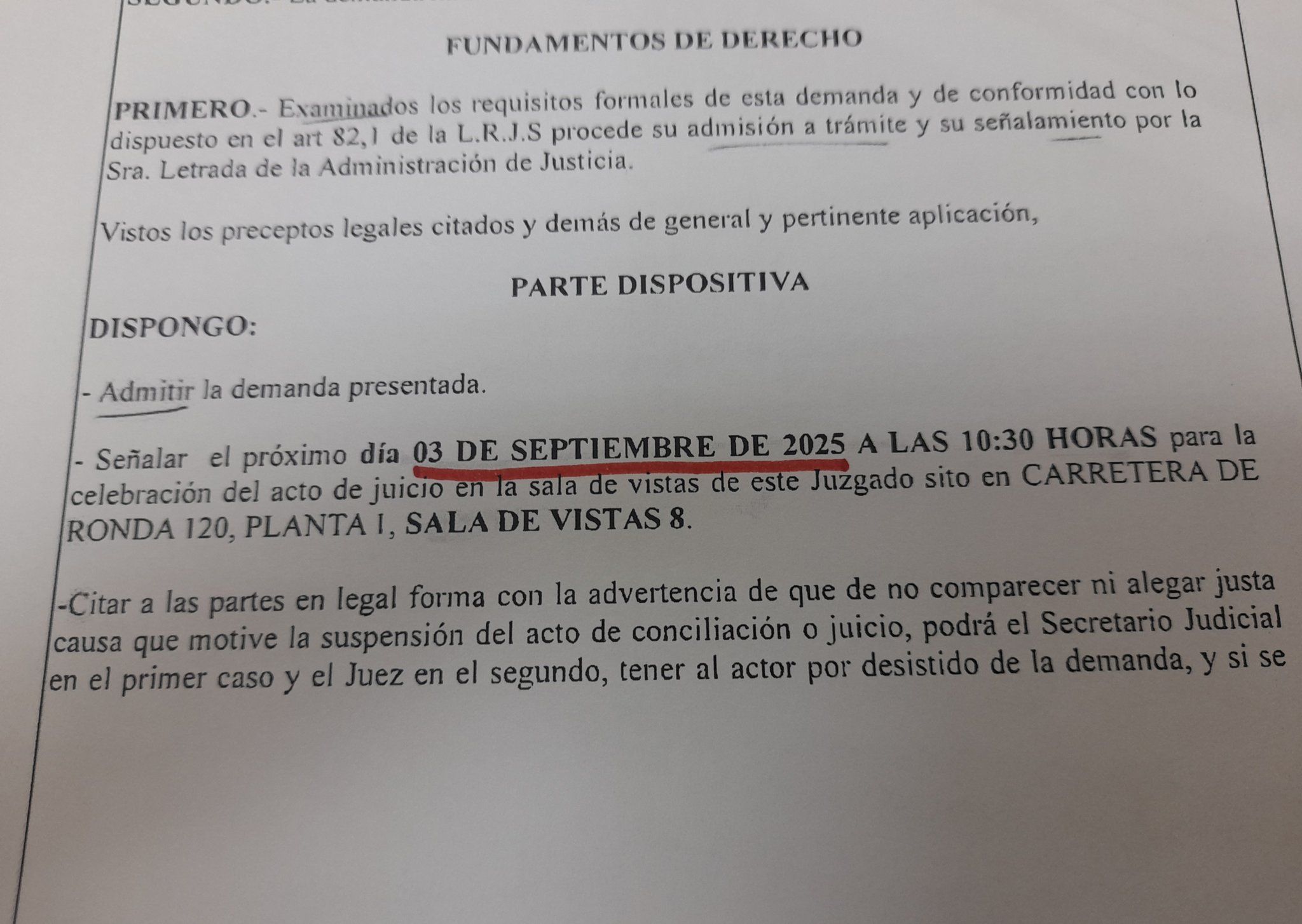 Así, el abogado de UGT Emilio Carrillo ha publicado en redes sociales la contestación a una demanda en la que se señala la comparecencia de las partes, la vista, para el 3 de septiembre de 2025. Hasta entonces, legalmente, poco más que recurrir para adelantar el acto judicial.