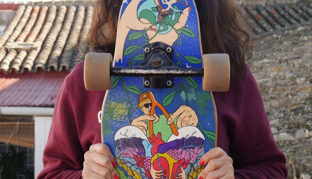 "Mi lienzo es la tabla de skate", para María Plata (Jerez, 1996) es sencillo, las ideas le fluyen rápidamente cuando está frente a un tablón de patinaje. "Cuando tengo un encargo me resulta muy difícil dejar un hueco de la tabla en blanco, algunos me han llamado barroca pero me gusta añadir detalles personales a la ilustración".