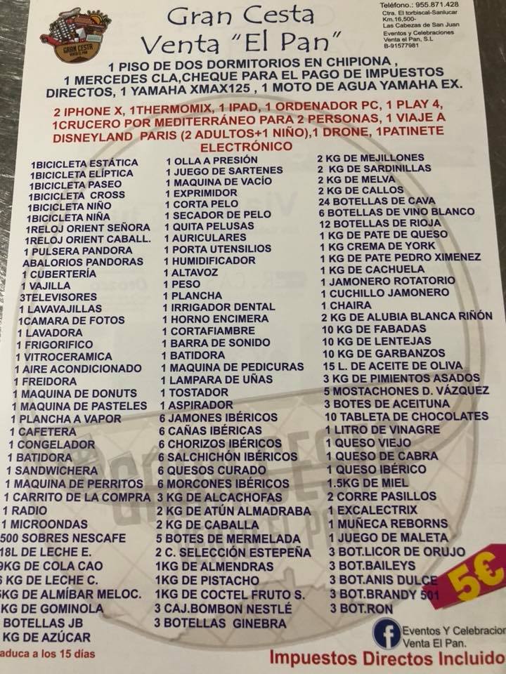 Tampoco falta una moto de agua, cuatro bicicletas, dos relojes, una cámara de fotos, dos Iphone X, una Play 4, un drone y un lote de abalorios Pandora. Pero más allá de los artículos materiales, también hay un lote de alimentos por kilos y bebidas: cacao, azúcar, jamones ibéricos, quesos, toda clase de embutidos, mermelada, atún de almadraba, garbanzos, lentejas, botellas de ginebra... Según adelanta ABC, el sorteo de la venta El Pan —a la salida de la autopista AP-4 dirección Sanlúcar y Chipiona— ya va por el 70% de los boletos vendidos, a la espera de "la traca final" con el inicio de la campaña de Navidad.
