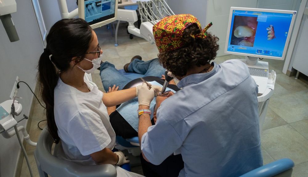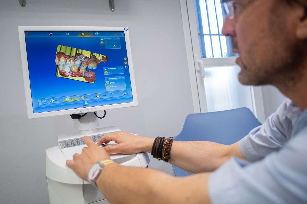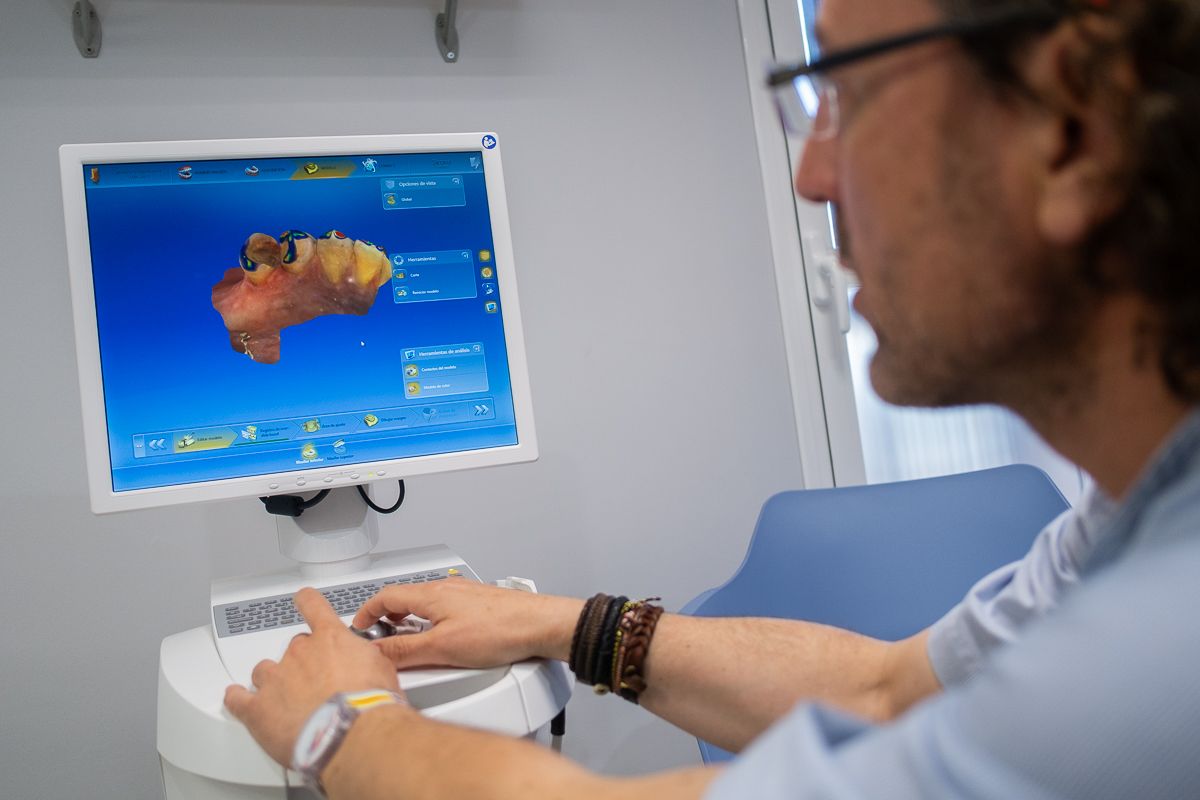 "Lo que acabo de escanear se puede ver aquí en la pantalla y lo bueno de esto es que con los colores se puede ver si el trabajo que has preparado tiene sitio o hay que rectificar", explica Fernando, que comenta que en apenas 48 horas la pieza dental puede estar en la clínica. Un sistema que se suma al ya utilizado con programas informáticos en esta clínica dental para los implantes, tras una década realizando cirugías guiadas por ordenador y tratamientos dentales y cirugías con un láser de diodos.