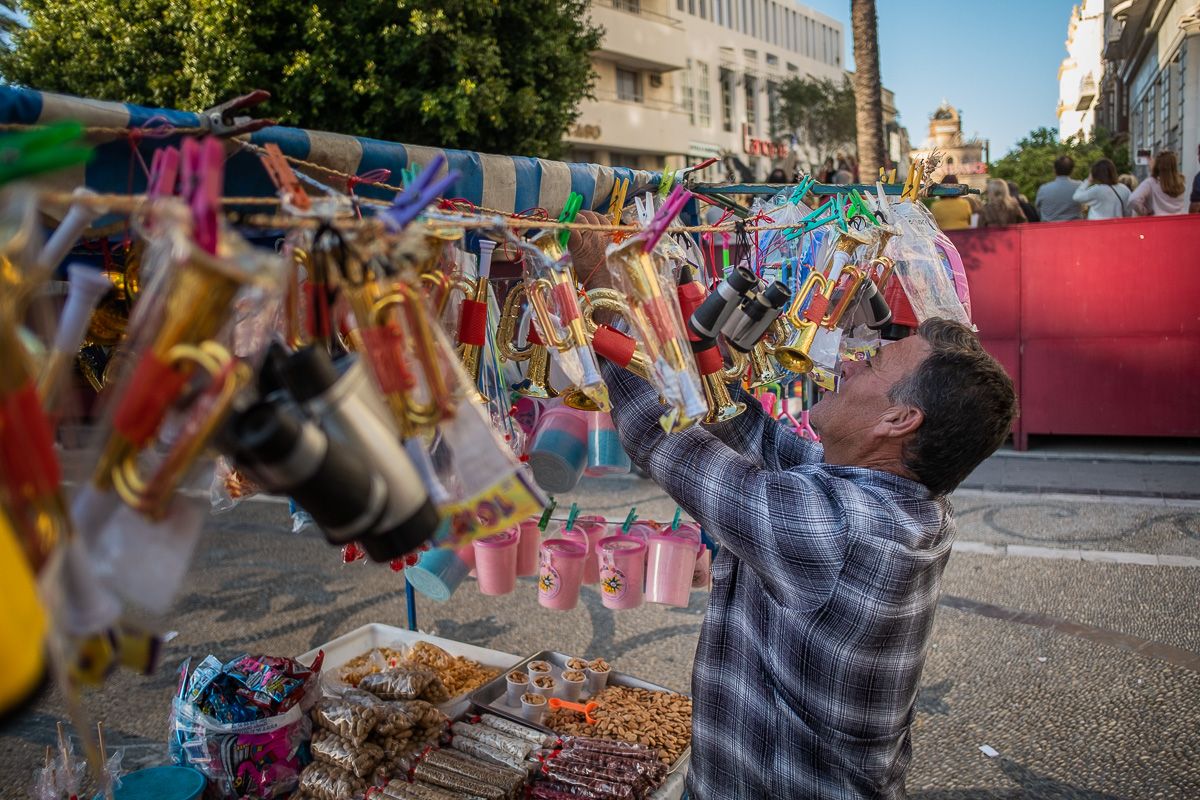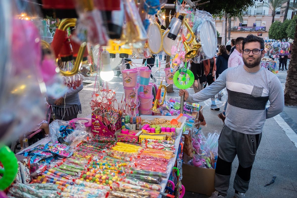 Acompañado durante más de tres décadas de su inseparable mujer acude a todos los festejos importantes de la ciudad: la Feria, la Semana Santa, el Carnaval… También llega cada domingo al rastro de la Alameda Vieja y ubica su puesto en las inmediaciones de El Alcázar. Es uno de esos vendedores ambulantes que trabajan cuando los demás disfrutan: “Nosotros pagamos una tasa por autorización al Ayuntamiento de 152 euros por toda la Semana Santa más el seguro de responsabilidad civil. Tenemos que vender bastante para cubrir gastos”, relata. “Los Domingos de Ramos y los Jueves y Viernes Santos son los mejores días. En un día bueno podemos hacer una buena caja, pero ten en cuenta que echamos al menos diez u once horas por jornadas, más el montaje. Montar este carrito nos ocupa al menos hora y media”.