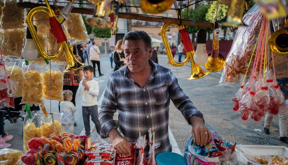 Es la Semana Santa una época en la que los fieles salen a procesionar y los menos religiosos se toman un respiro en sus ajetreadas vidas, aminorando el ritmo de trabajo habitual. Pero en esta semana de rezo y de pasión también hay gente que se dedica a sacar sus familias adelante y trabajar para los demás. José López permanece, cada Semana Santa, y desde hace 36 años en la plaza del Arenal con su carrito ambulante endulzando la vida de quienes viven in situ esta celebración. Su imagen es casi más antigua que la de los propios palcos: “Empecé porque me lo propuso mi suegra. Mi mujer estaba embarazada de nuestro hijo, yo estaba parao y me lo insinuó ¿por qué no montas un puestecito de chucherías en la Semana Santa, probé y aquí estamos, más de treinta años después vendiendo almendras, patatas, juguetes, refrescos... tenemos de todo”.