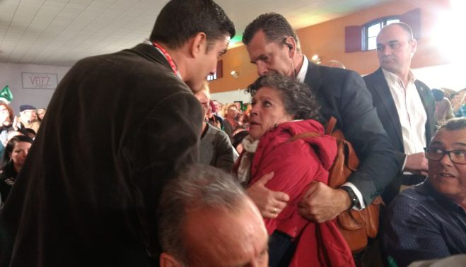 "Nosotros luchamos pacificamente para que no haya corrupción. Solamente vamos a denunciar la verdad, que es lo que les duele", dice María Antonia, ya que denuncia haber sido agredida por los escoltas del PSOE andaluz. "Me jalaron, me pegaron patadas y me arañaron". "El que sale en la imagen me pegaba patadas en las espinilla, menos mal que llevaba botas de agua... Me arrastraron, me empujaron, me insultaron y me zarandearon hasta que me sacaron de allí. Tengo arañazos en los brazos. Y cuando salí fuera, empezó otra odisea. Los que estaban en el mitin me insultaron, me intentaron quitar la pancarta... Fue horroroso", relata a este digital.