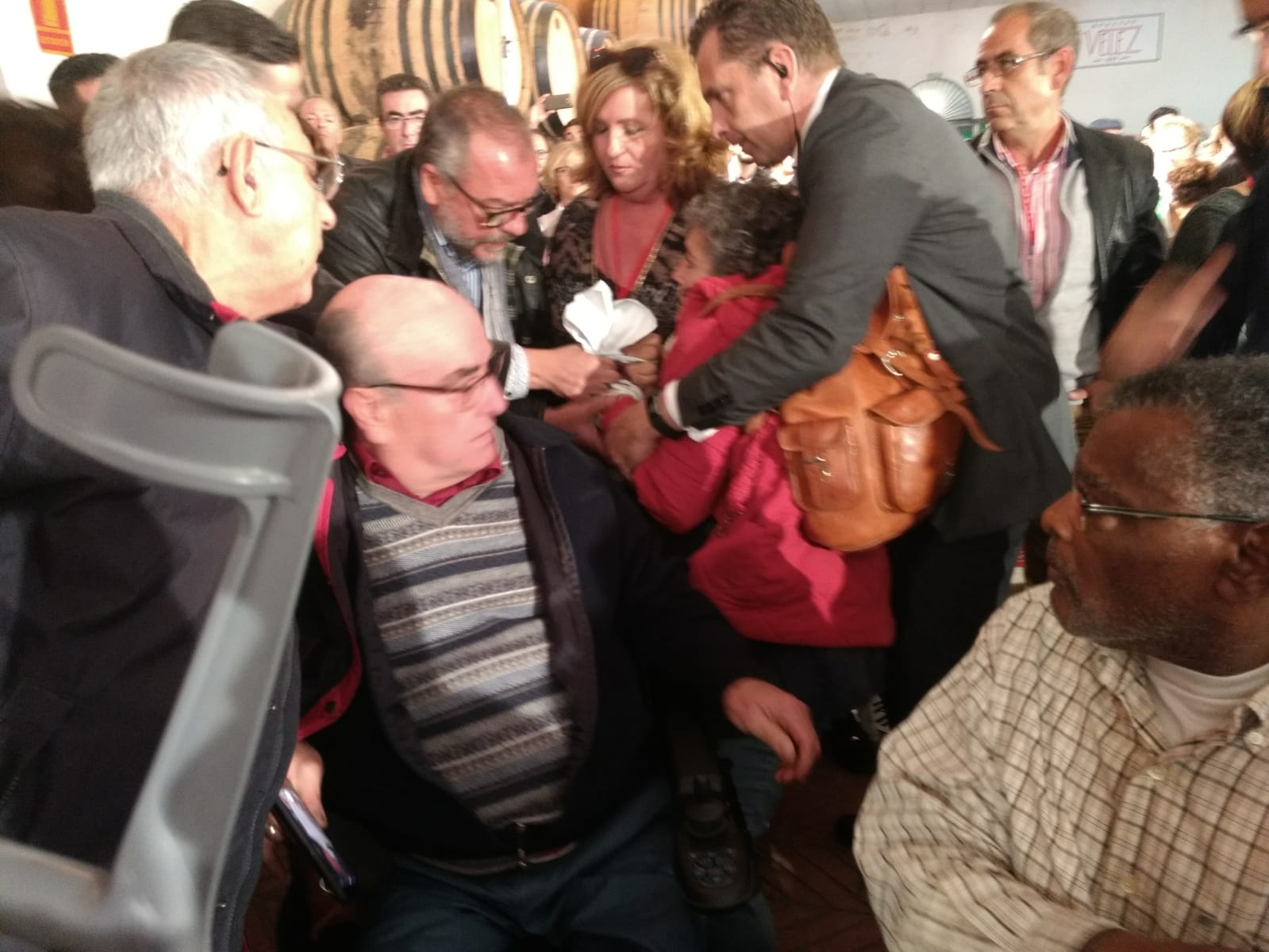 La gaditana siendo desalojada de las bodegas Vélez, donde se celebró el primer mitin de Susana Díaz. FOTO: LVDS.