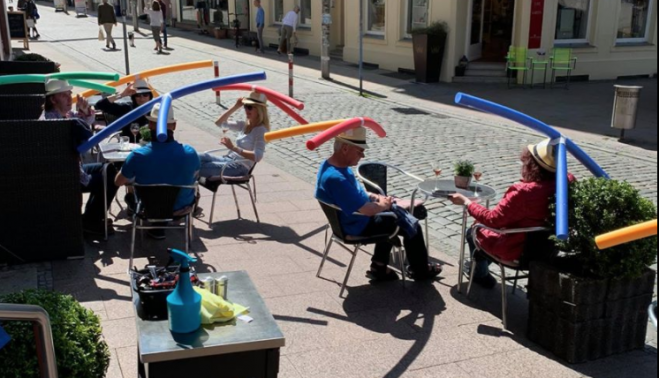 Colocar churros de natación en la cabeza de sus clientes. Es la idea que ha tenido un bar alemán para garantizar el distanciamiento social en su terraza. La imagen de la cafetería y pastelería Rothe, de la ciudad de Schwerin, está dando la vuelta al mundo, gracias a la original idea que han tenido los propietarios del establecimiento, que han elaborado unos sombreros caseros con este material.