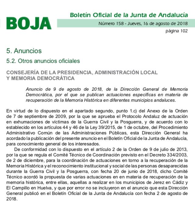 El Boletín Oficial de la Junta de Andalucía (BOJA) ha publicado este jueves un anuncio de la Dirección General de Memoria Democrática mediante el que se publican actuaciones específicas en materia de recuperación de la Memoria Histórica en diferentes municipios andaluces. En concreto, en la localidad onubense de El Campillo y en el llamado Parque Scout de Jerez. Tal y como se comprometió el director general de Memoria Democrática, Francisco Javier Giráldez, en la última reunión mantenida en la ciudad con los representantes de la plataforma jerezana por la Memoria Democrática y la asociación de familiares y amigos por la Recuperación de la Memoria Histórica en Jerez y su comarca, el comité técnico de coordinación ha propuesto la "indagación-localización, delimitación, exhumación, estudio antropológico e identificación genética, si procediera" en una de las zonas de la ciudad donde se cree que pueden reposar el mayor número de asesinados tras el Golpe.