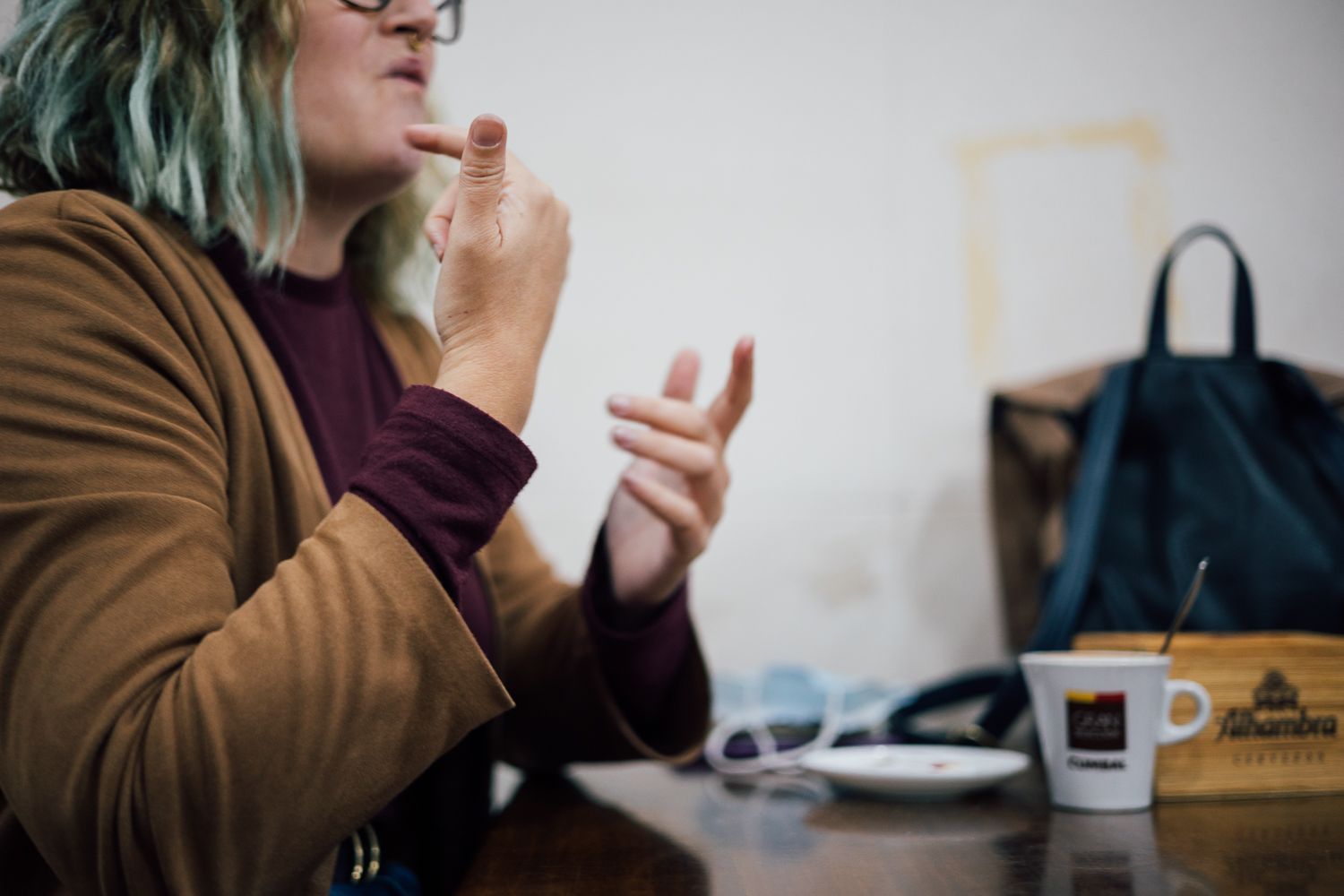 Para Celia, “es muy difícil encontrar a alguien que sepa decir lo básico”. Le da rabia que las personas sordas sientan incomprensión constantemente. En su caso, ella se empezó a interesar cuando era pequeña y ya lleva cinco años practicándola. “Veía una serie de Disney Channel en la que salían personas sordas y tenía mucha curiosidad por entenderlas sin tener que leer los subtítulos”, cuenta la joven a lavozdelsur.es. Su afán era apuntarse a clases y empaparse de su gramática, pero no era fácil en la localidad. “Yo le decía a mi madre, quiero aprenderla, igual que el inglés, yo lo veo como una lengua más y no entendía que no tuviera esa posibilidad, me parecía impactante poder apuntarme a baile, pero no a una lengua diferente”. Las palabras de Celia resuenan en la sala. Tenía muchas ganas de conocerla y, desde entonces, no ha abandonado.