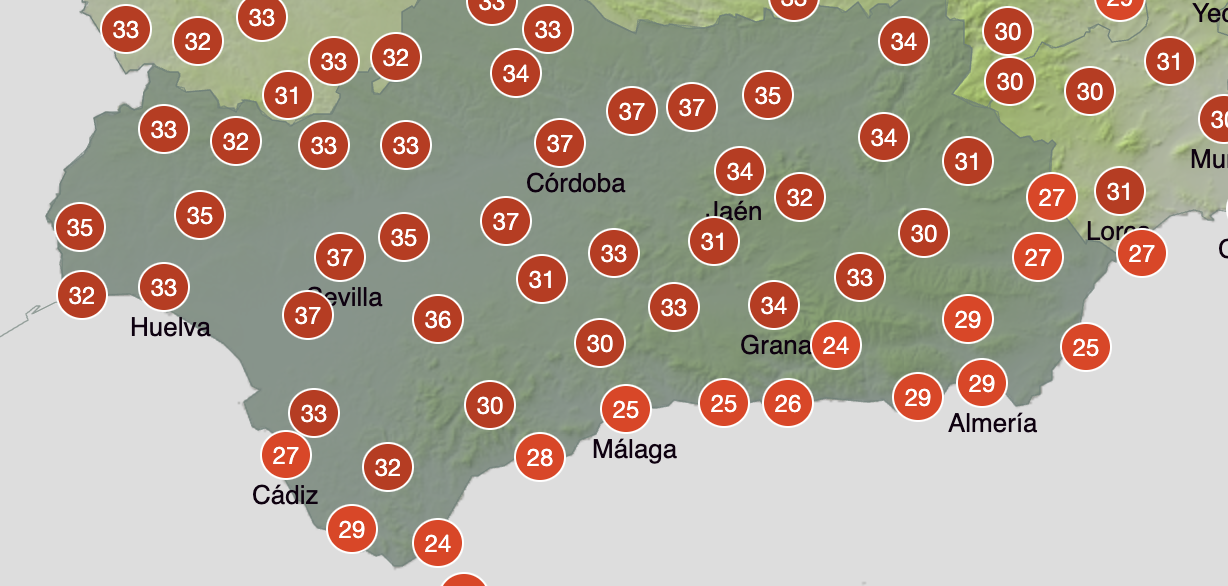 Para la jornada del viernes, se esperan máximas de 35ºC en el Valle del Ebro, también en la zona centro y en la mitad sur. El portavoz ha detallado que en los valles del Guadiana y Guadalquivir este día se superarán los 38ºC grados de temperatura máxima.