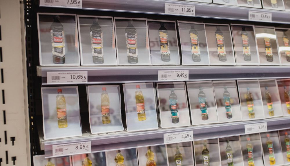 El límite ha llegado para algunos hipermercados. El supermercado Suma, ubicado en Luis Montoto, en Sevilla, ha cambiado las botellas de aceite por fotos para evitar más descalabros en las cuentas al final del día.