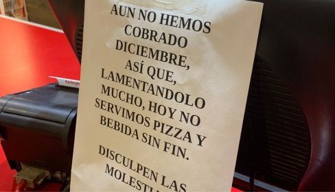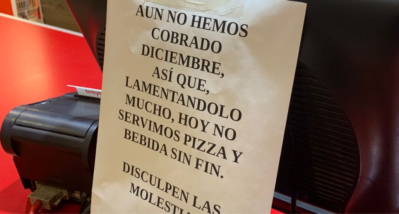 “Aún no hemos cobrado diciembre, así que, lamentándolo mucho, hoy no servimos pizza y bebida sin fin. Disculpen las molestias”, se podía leer en un cartel delante de una caja registradora de un establecimiento.