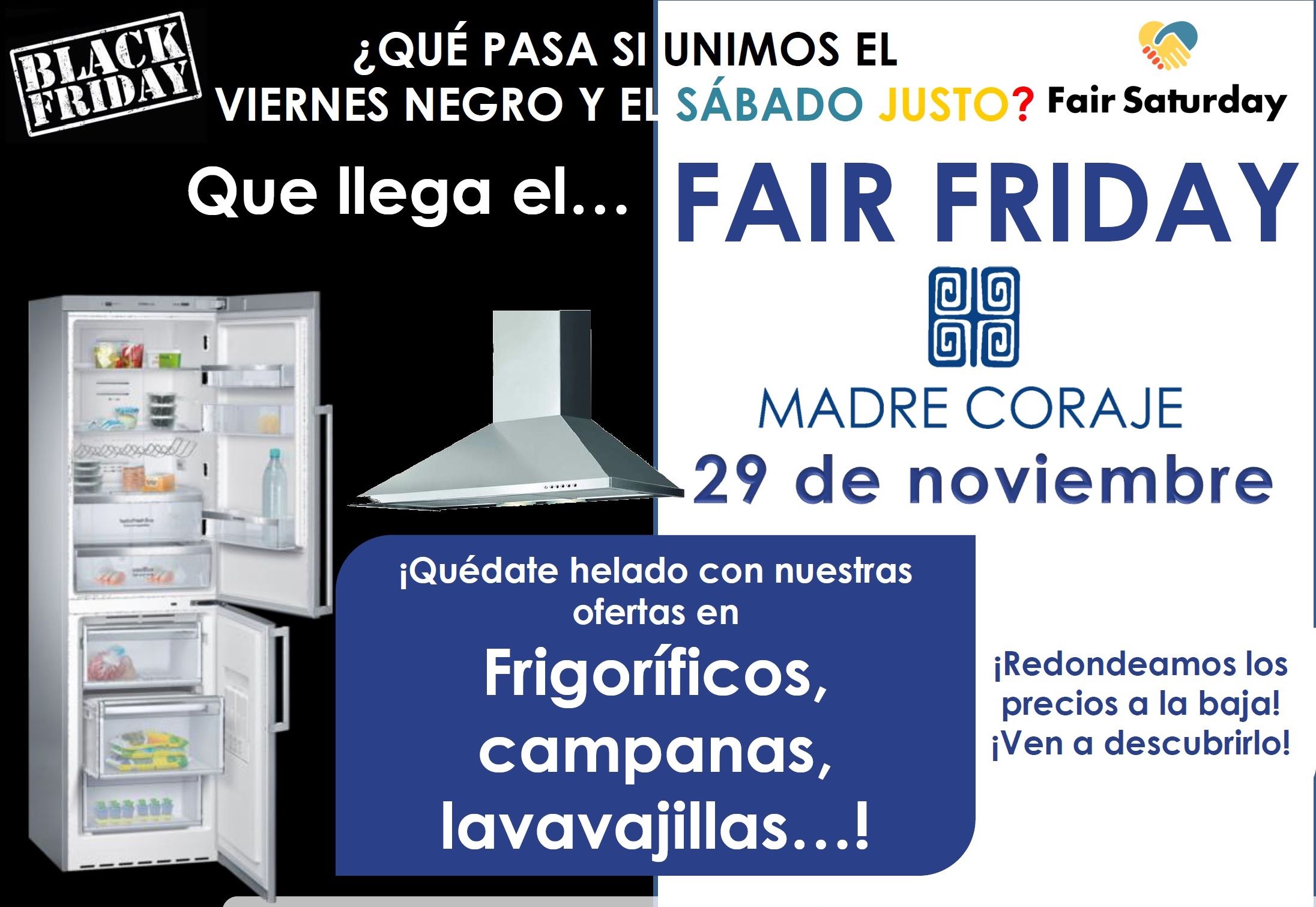 La ONG para el Desarrollo Madre Coraje lanza este viernes 29 de noviembre su Fair Friday-Viernes Justo poniendo a la venta, a precios muy económicos, electrodomésticos con una segunda vida con cuyos beneficios se apoyan acciones sociales, educativas y formativas dentro y fuera de nuestras fronteras. Las tiendas que Madre Coraje tiene en Jerez, Huelva y Sevilla se suman a esta iniciativa con hornos-microondas a 180 euros, lavavajillas a 120 euros, frigoríficos a 200 euros o campanas extractoras desde 40 euros, entre otros muchos artículos.