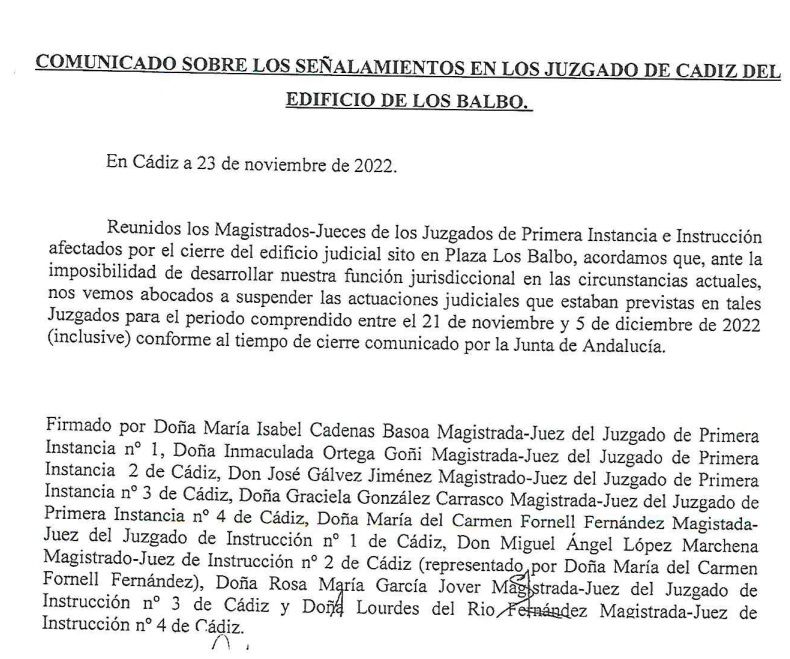 Los magistrados jueces de los ocho juzgados de primera instancia e instrucción afectados por el cierre del edificio sito en Plaza Los Balbo han acordado que “ante la imposibilidad de desarrollar nuestra función jurisdiccional en las circunstancias actuales nos vemos abocados a suspender las actuaciones judiciales que estaban previstas en tales juzgados para el período comprendido entre el 21 de noviembre y el 5 de diciembre de este año, inclusive, conforme al tiempo de cierre comunicado por la Junta de Andalucía", según la información a la que ha tenido acceso lavozdelsur.es en el TSJA.