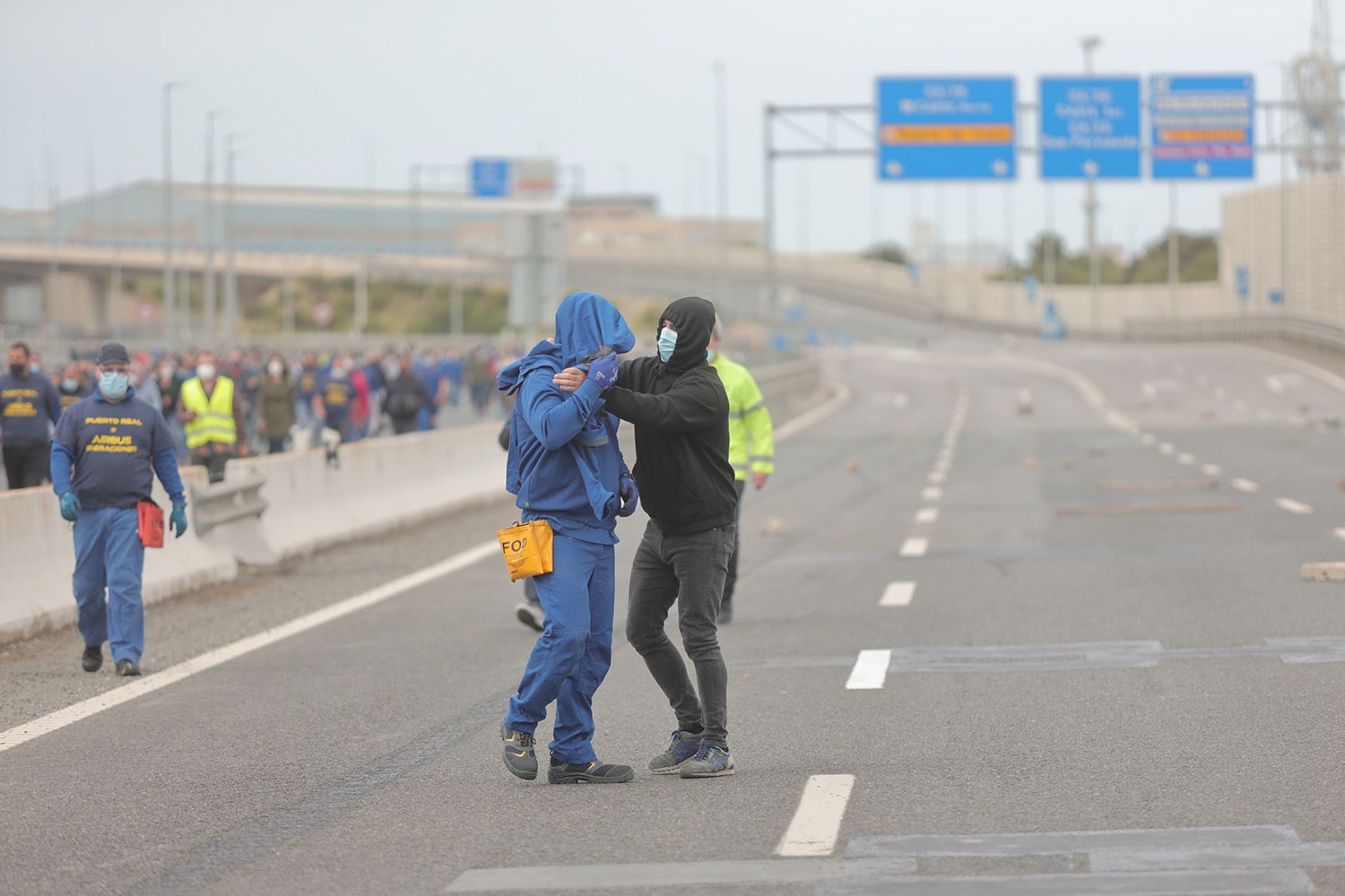 Los manifestantes saltan las vallas que comunican con la carretera de acceso a Cádiz.