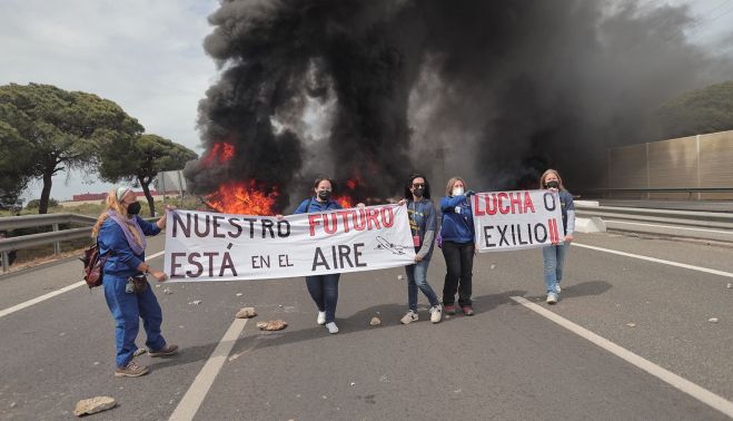 "Nuestro futuro está en el aire", se lee en la pancarta que portan unas manifestantes que ven peligrar su empleo.