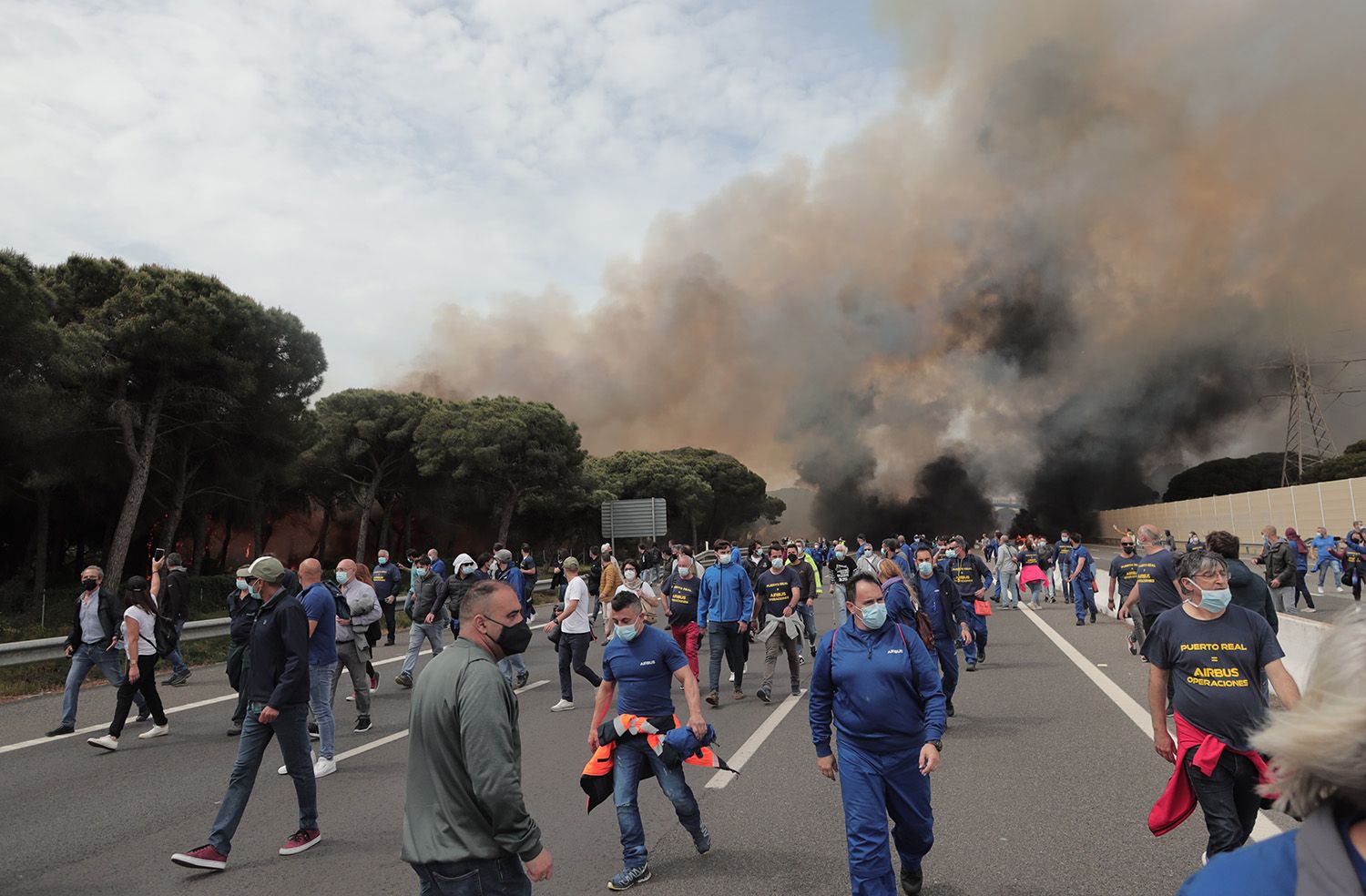 Los manifestantes huyen tras desatarse un incendio durante la protesta de la plantilla de Airbus Puerto Real.