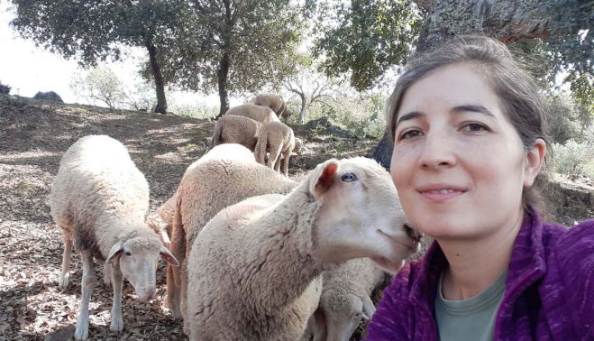 Entre pastos y animales, una vecina de Cazalla de la Sierra se adentra en los senderos de la Sierra Norte de Sevilla. Todos los días, Marta Cornello, de 40 años, respira una bocanada de aire puro del campo y se dispone a trabajar en plena naturaleza, donde “me siento más completa”. Esta ganadera extensiva de cerdo ibérico puro de bellota, ovejas merinas y olivar de montaña, apasionada de la madre tierra, sale cada mañana temprano con sus animales. “Ellos comen todos los días pase lo que pase, no entienden ni de crisis, ni de cambio climático, las criaturas tienen que estar sanas y felices”, expresa Marta desde su pueblo.